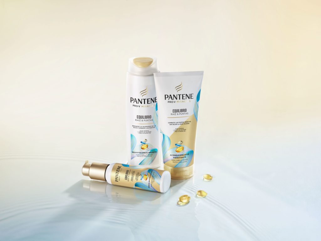 La línea Pantene Pro-V Miracles Equilibrio Raíz y Puntas está compuesta por su shampoo equilibrante, que destaca por ser la primera fórmula translúcida de tono blanco de Pantene, acondicionador hidratante y un sérum revitalizador. Todos los productos son libres de colorantes y parabenos añadidos.