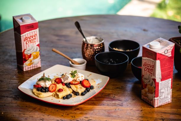 Modo de preparación: Untar panqueques con manjar y cerrar en forma de pañuelos para después agregar Bravo Crem. Posterior montarlos en plato con forma de fila. Finalmente decorar con crema montada, arándanos, frutillas cortadas, frutos secos triturados y menta.