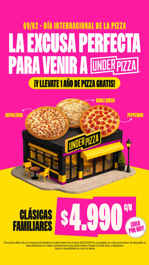“En Under Pizza cuidamos el bolsillo de todos porque creemos que comer rico debe ser algo cotidiano. Y en este día de la pizza, nuestro propósito no cambia; ofreciendo las pizzas más ricas y convenientes de Chile de manera presencial. Queremos que nuestras tiendas sean un punto de encuentro donde siempre se pueda compartir, sin pagar de más”, comenta Marieta Medina, Gerente Comercial y Marketing de Under Pizza.