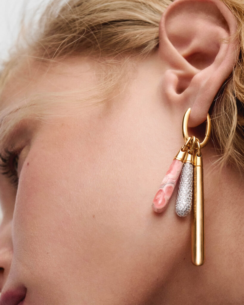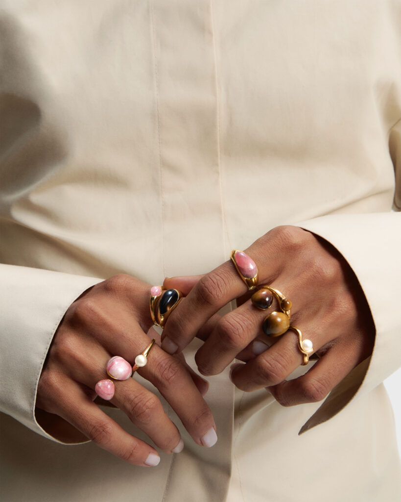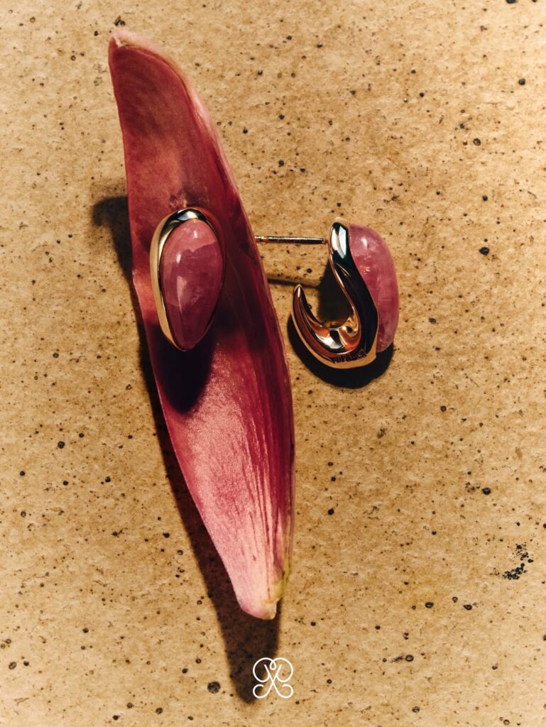 Fabricadas con baño en oro de 18K, e incorporando gemas cuidadosamente seleccionadas como la rodocrosita, el cuarzo y la perla, estas piezas elevan lo cotidiano desde el diseño y la materialidad.